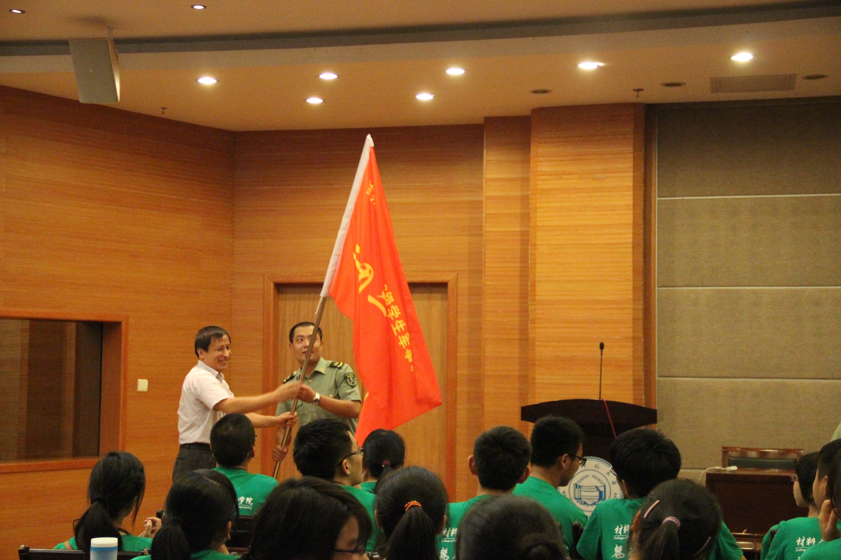 在此次会议中,胡书记代表学院党政对施训教官表示热烈欢迎,对受训学员提出严格要求和殷切希望。他表示,军训既是落实党的指导方针,亦是同学们大学生活的组成部分。本次军训通过精心组织、科学安排,根据以生为本的理念,深入学生,让学生明白军训的意义,从而使学生认真参训,向教官学习。随后,邱院长向教官代表吕文恺授予连旗。