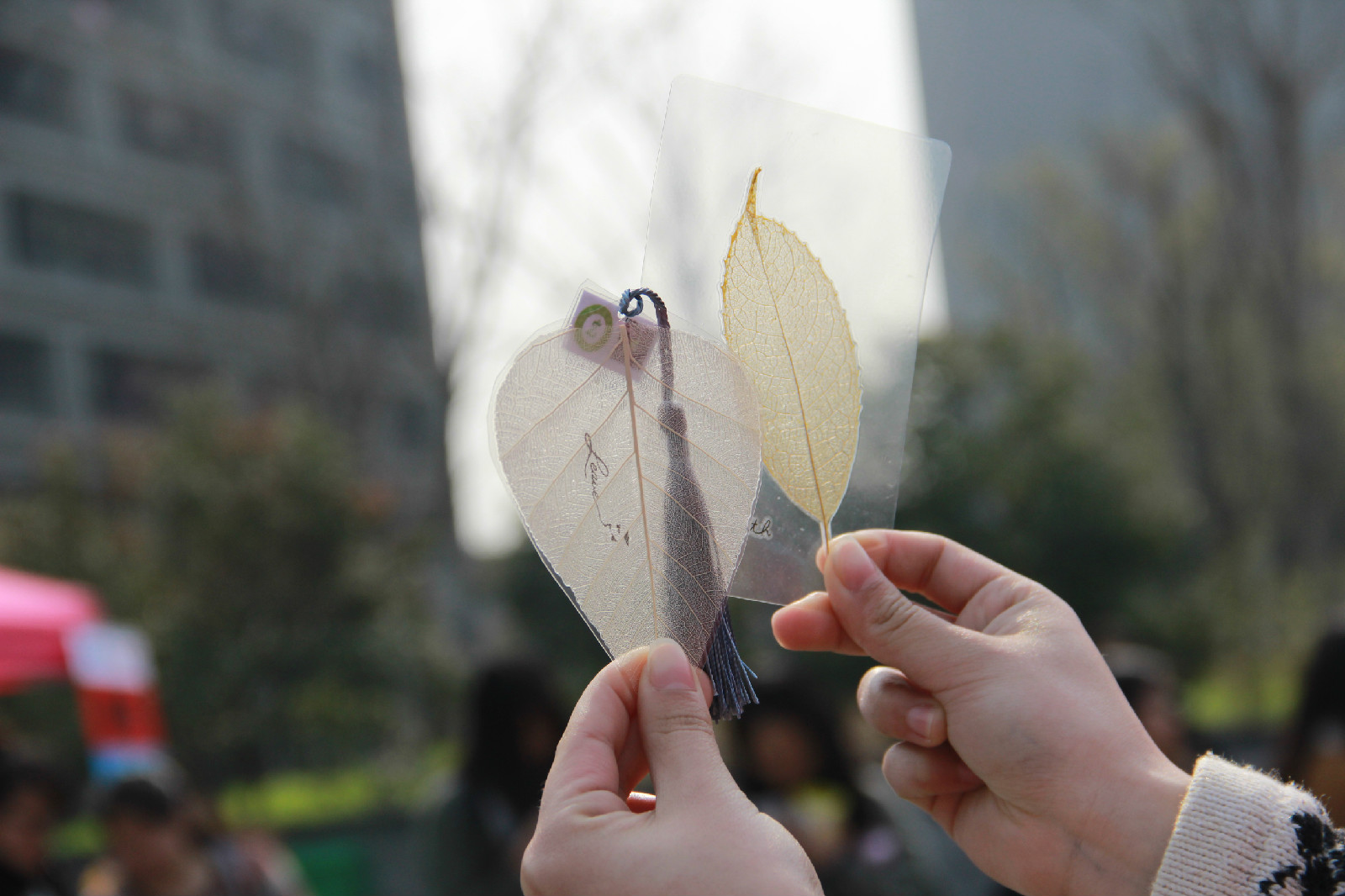 活动还未开始,就有许多同学怀着好奇心涌了上来,工作人员也耐心地回答同学们提出的问题。14:30,活动准时开始,桌边立刻坐满了跃跃欲试的同学。由于很多同学都是第一次尝试做叶脉书签,他们也格外小心谨慎,唯恐破坏了曼妙轻柔的树叶。刷完树叶后,同学们各自挑选了心仪的纹身贴与叶脉一起塑封,永久地保存下这份美好记忆。结束制作后,参与的同学都心满意足地带着专属于自己的叶脉书签和工作人员道别。除此之外,参与本次活动的前100名同学还幸运地获得了精品书签。