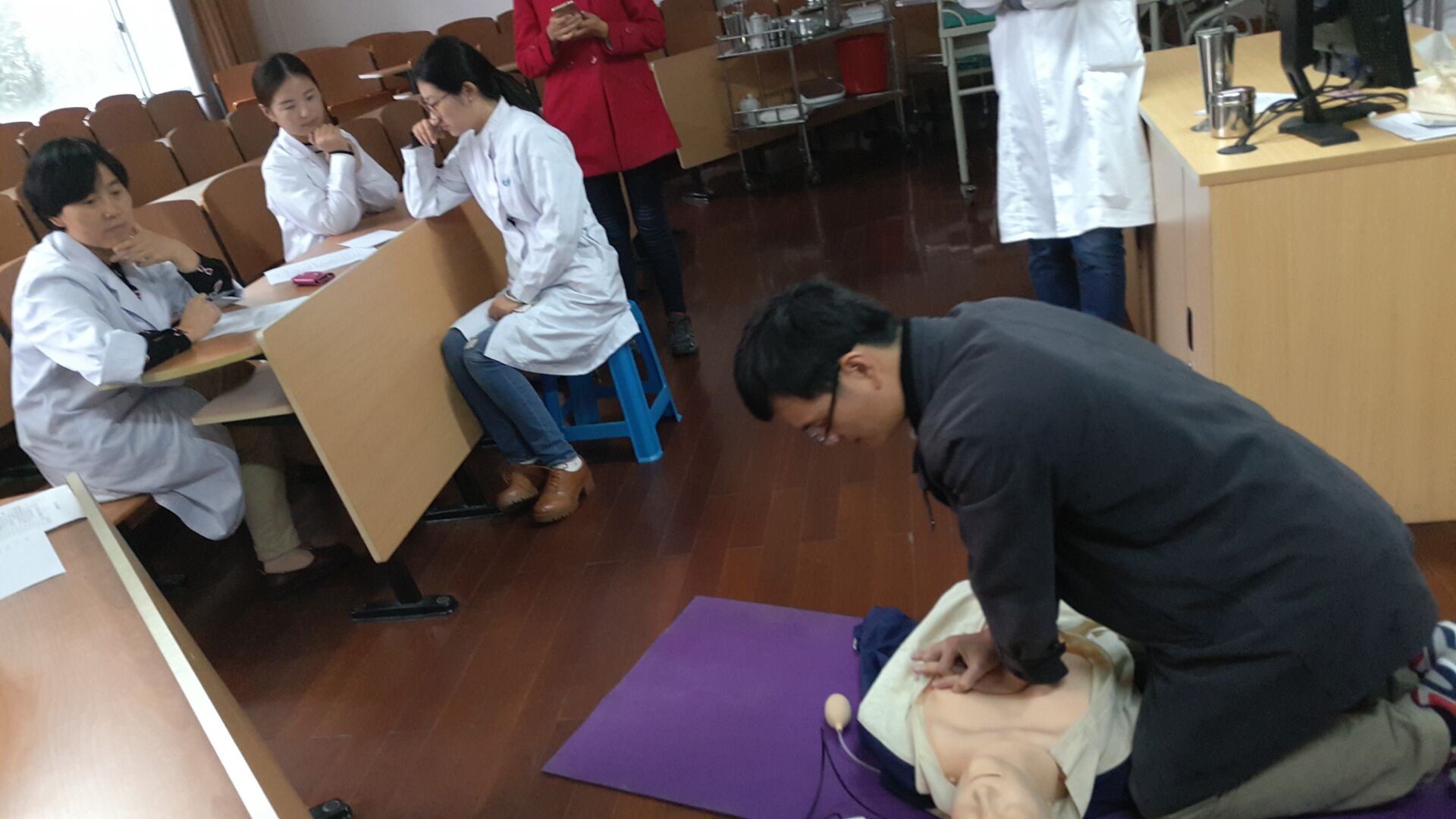 本次培训主要分为理论培训、技能培训与竞赛两部分进行。培训会邀请了医学院许虹教授主持授课,会上许虹教授生动形象地讲解了心肺复苏术(CPR)及创伤救护:止血、包扎、固定、搬运等急救知识,让我们深刻的认识到了 在“黄金救命时间”中第一施救者的重要作用,学习并掌握了专业的现场急救知识与技能。