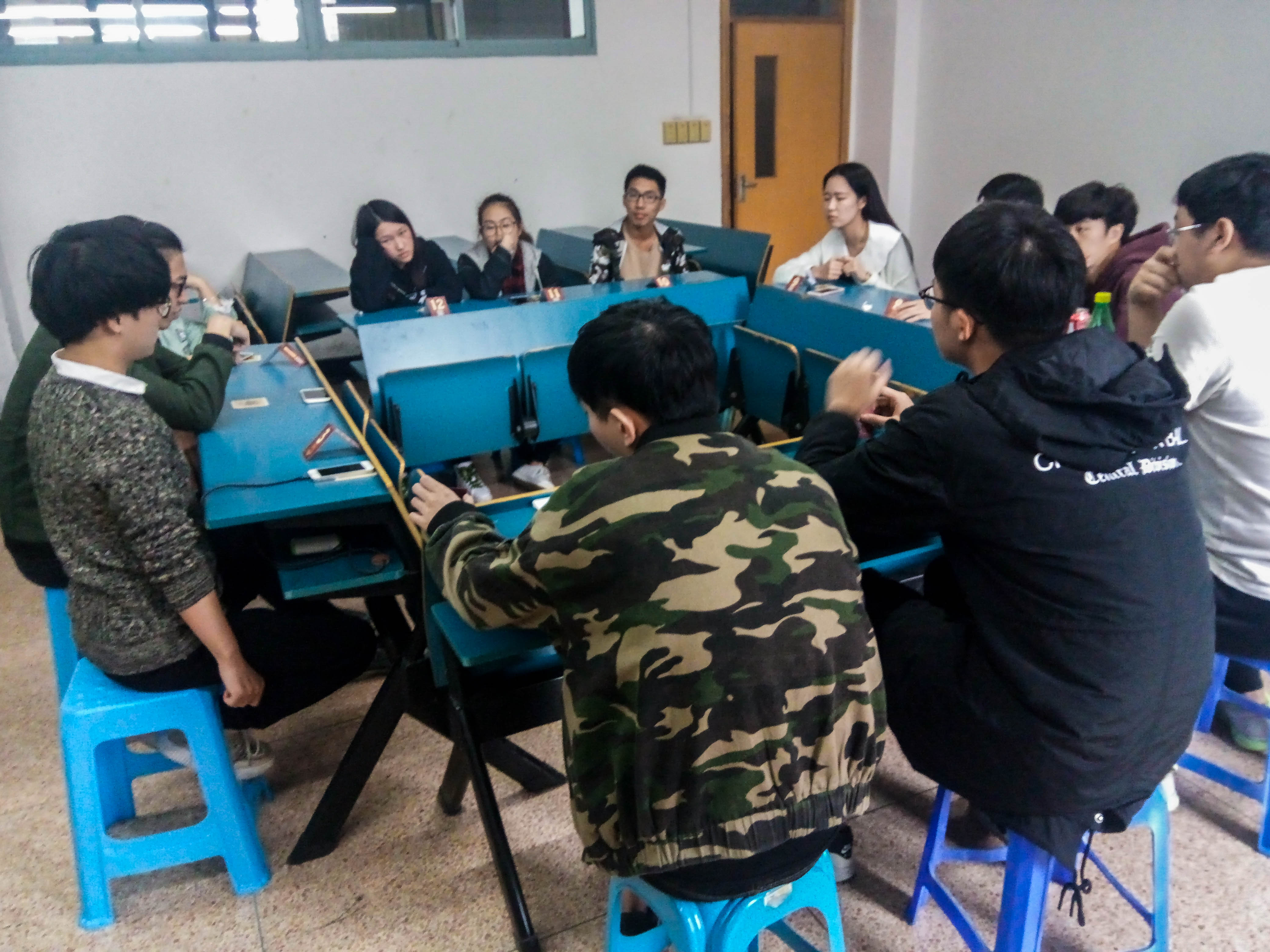 11月12日13:00,由色情聊天U-know桌游社主办的“天黑请闭眼”之狼人杀活动在A-212教室如期举行。桌游社社长龚子涵同学主持了本次活动。
