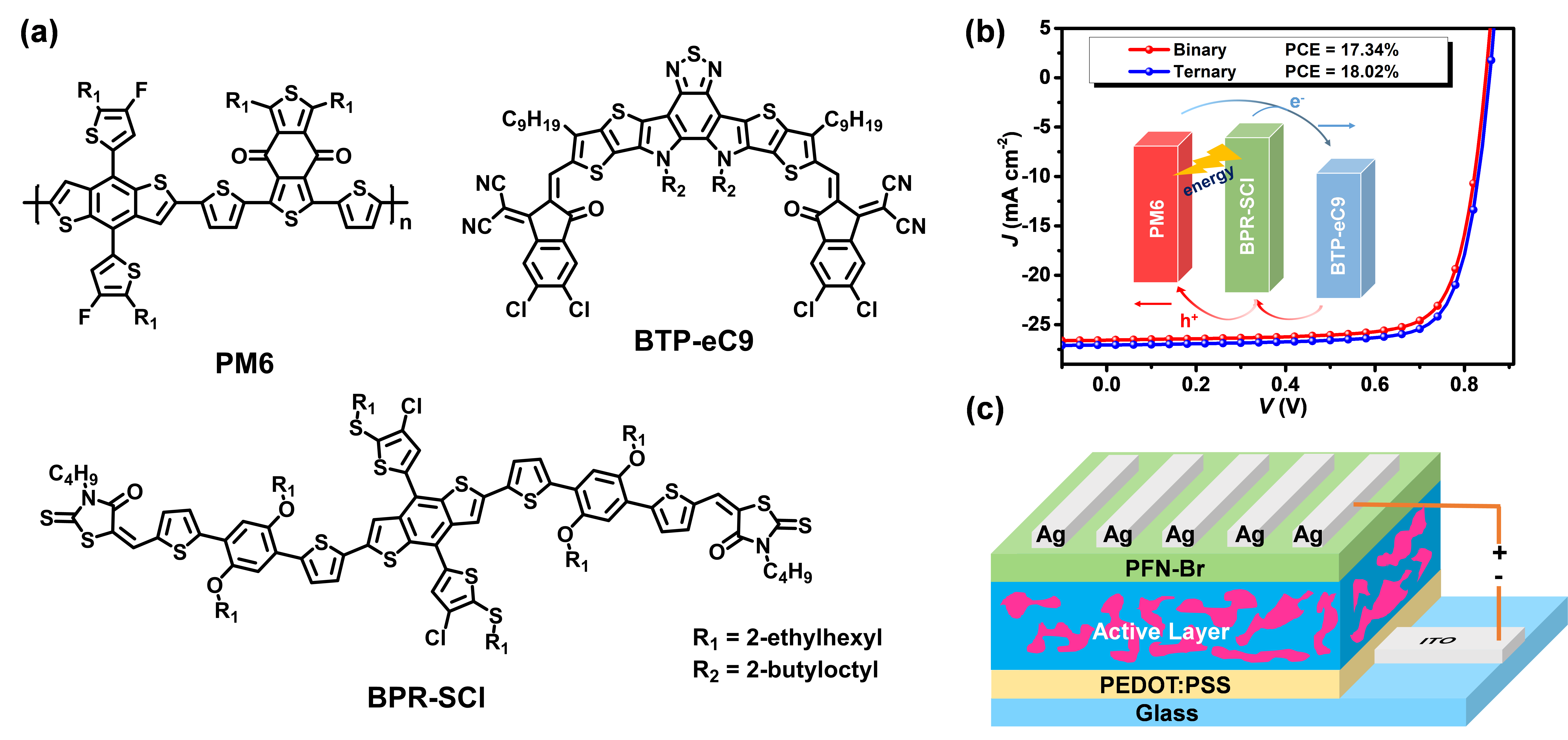 图1 (a)PM6,BPR-SCl和BTP-eC9的化学结构式(b)二元和三元器件的电流密度-电压曲线和(c)器件结构示意图。