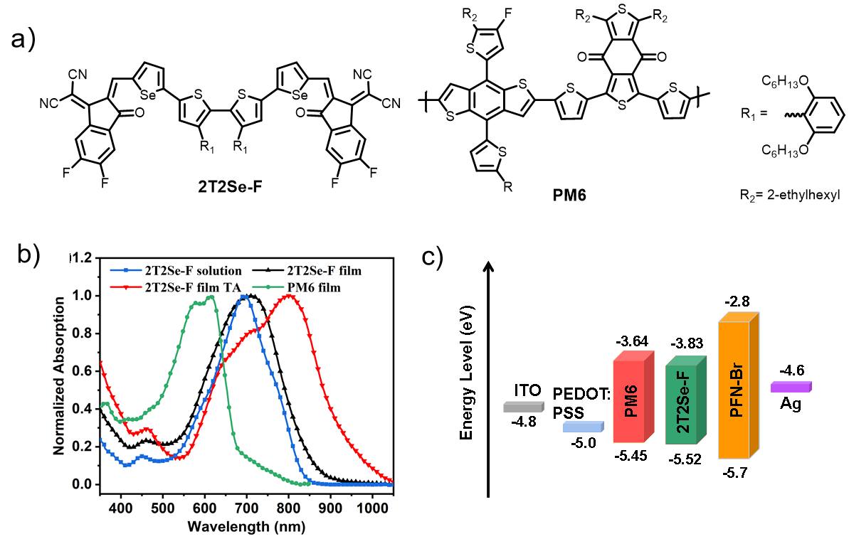 (a)PM6和2T2Se-F的化学结构式 (b)PM6和2T2Se-F的紫外可见近红外吸收光谱和 (c)器件能级图
