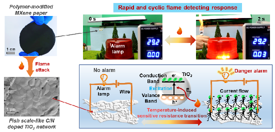 研究结果显示,该水溶性聚合物改性MXene 薄膜构筑的新型火灾预警传感器具有以下显著的特征(图2):(1)相比于纯MXene薄膜无法提供灵敏的预警信号,水溶性聚合物改性MXene 薄膜显示出快速的火焰探测响应(~1.8 s),且火焰撤走后电阻信号可以快速回复(~1.0 s);(2)改性MXene薄膜显示稳定的循环火焰探测响应,即使在300 s、600 s乃至1800 s以上的长时间火焰攻击或100次火焰进攻后仍能够表现出良好的火焰预警响应的循环稳定性和极高的灵敏度值,这是氧化石墨烯类传感器无法实现的;(3)改性MXene 薄膜构筑的火焰探测预警传感器具备高灵敏的电阻开关响应行为,电阻变化均>4个数量级。通过观察和分析火焰进攻过程中薄膜的微观结构演变,作者首次发现和证实水溶性聚合物可以促进MXene的快速氧化,形成坚固的鱼鳞状C/N掺杂二氧化钛结构,诱导MXene网络由导电快速转变为绝缘状态。令人感兴趣的是,在循环火焰进攻过程中,火焰高温会激发该鱼鳞状二氧化钛结构的能带跃迁,导致其电阻在导电-绝缘间快速可逆转变,进而实现火焰快速、循环探测响应行为。