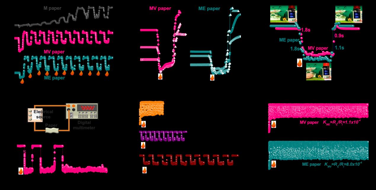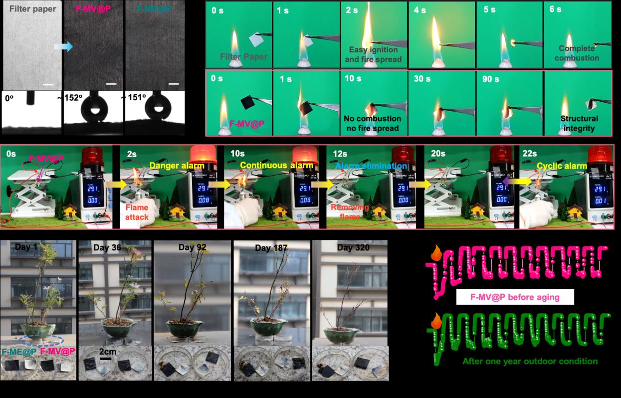 在上述研究结果基础上,作者进一步引入全氟硅烷表面处理制备了多功能MXene基涂层(图3)。该涂层不仅可以实现易燃纤维纸的表面超疏水化和绿色阻燃化,而且能够提供稳定可靠的火灾循环报警信号。值得注意的是,该涂层在复杂气候环境中放置一年后仍具备稳定可靠的火焰循环探测响应行为,这为易燃材料的火灾安全和预防提供了新的途径。