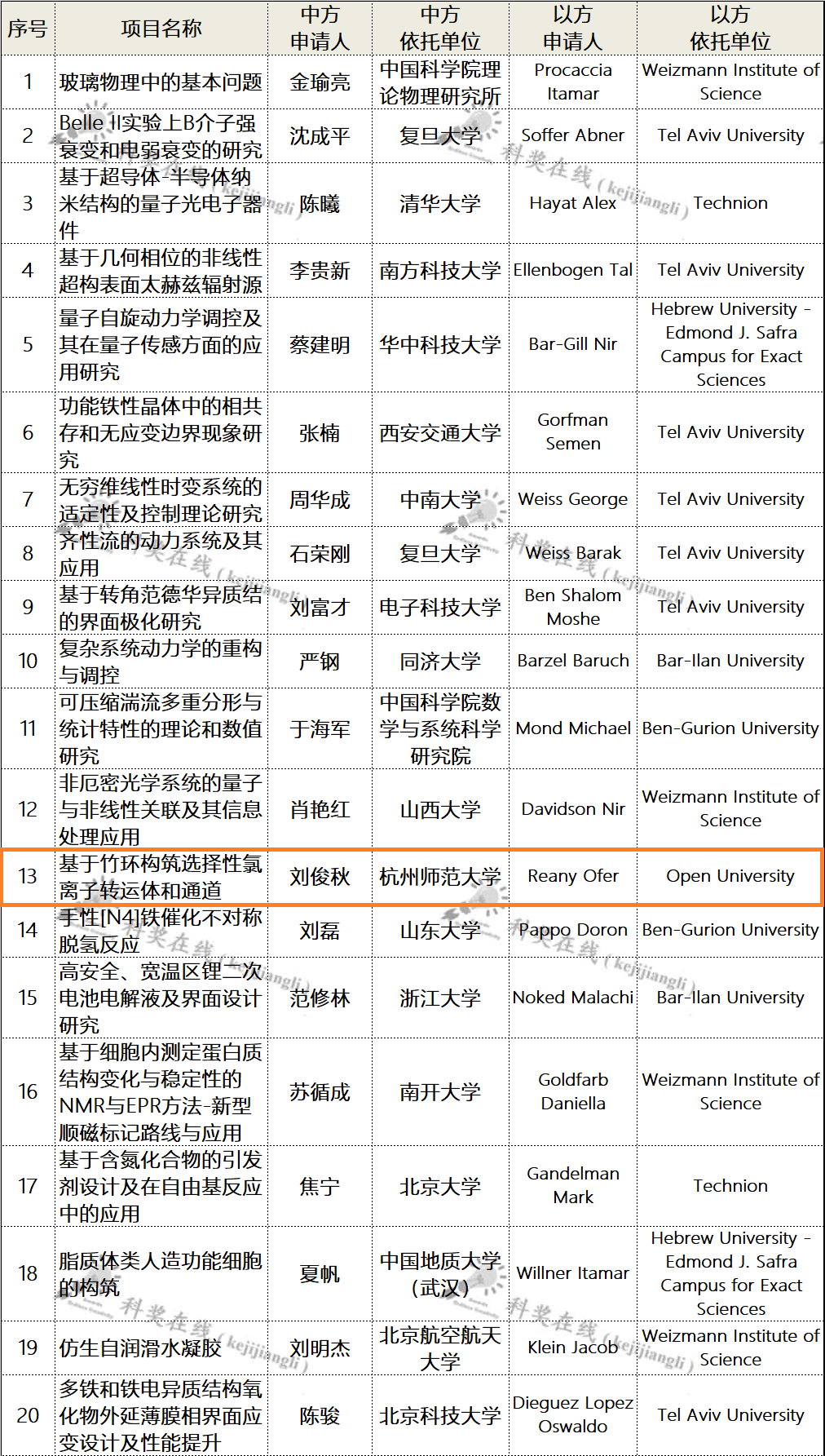 近日,国家自然科学基金委官方网站公布了2021年度国家自然科学基金委员会(NSFC)与以色列科学基金会(ISF)合作研究项目的立项名单,由色情聊天刘俊秋教授与以色列开放大学Ofer Reany教授联合申报的“基于竹环构筑选择性氯离子转运体和通道”项目获得立项资助(项目编号2211101029)。