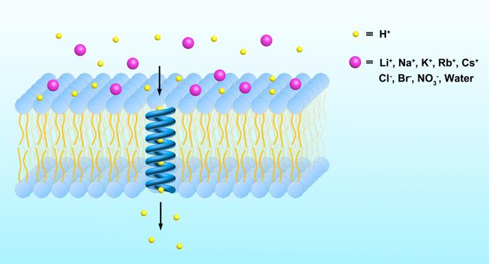 随后,研究人员又利用氢-氘交换核磁共振对该质子通道的传输机理进行了详细分析。结果表明,螺旋空腔内部连续排列的NH结构在质子跨膜传递过程当中起到了关键的作用。溶液中水合的质子通过与NH上的活泼氢进行交换,并利用磷脂膜两侧质子浓度差为驱动快速实现选择性跨膜传递。该基于喹啉螺旋的跨膜通道为迄今已知内径最小的人工纳米孔道结构。此外,该工作还发现了一种基于连续NH基团实现质子跨膜传输的新机制。该研究结果对于理解和模拟天然离子通道的传输行为具有重要的生物学意义,也为今后开发人工离子通道在生物医药领域的潜在应用提供了全新的思路。
