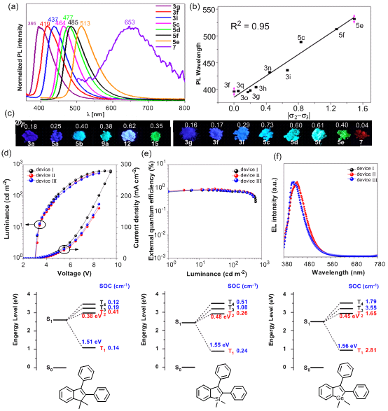 在优化条件下,作者首先高效构建了一系列2,3-位具有不同电子效应的锗杂共轭分子,并通过后修饰如通过吡啶成盐,获得了一种线粒体靶向的AIE探针。该方法简单高效、底物范围广且易于功能化,并将该方法扩展到合成双边苯并锗咯和锗桥联梯状化合物。通过对单晶的Hirshfeld表面分析对这些分子的光电特性的研究,阐述了固态发光强度与分子堆积方式和分子间作用力之间的关系。通过对光物理性质的详细研究,揭示了2, 3-位取代基哈密顿常数之差的绝对值和发光波长成线性关系,指导新一代锗杂化合物的理性设计。另外,首次将锗杂光电化合物应用于OLED器件中(图2)。