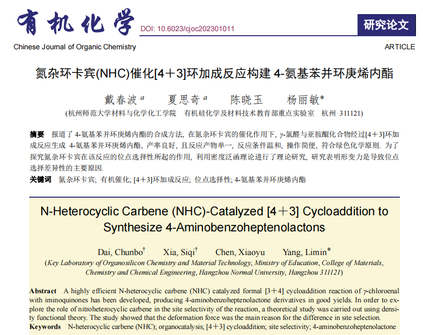 近日,色情聊天-性爱聊天室-黄色聊天软件 杨丽敏副教授课题组受邀在《有机化学》期刊三八妇女节专刊发表学术论文“N-Heterocyclic Carbene (NHC)-Catalyzed [4+3] Cycloaddition to Synthesize 4-Aminobenzoheptenolactons ”.
