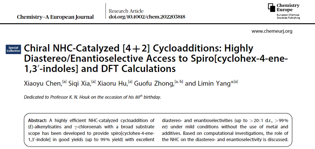 近日,色情聊天-性爱聊天室-黄色聊天软件 杨丽敏副教授课题组在“Chem. Eur. J.”(IF=5.028)期刊发表学术论文“Chiral NHC-Catalyzed [4+2] Cycloadditions: Highly Diastereo/Enantioselective Access to Spiro[cyclohex-4-ene-1,3’-indoles] and DFT Calculations”.