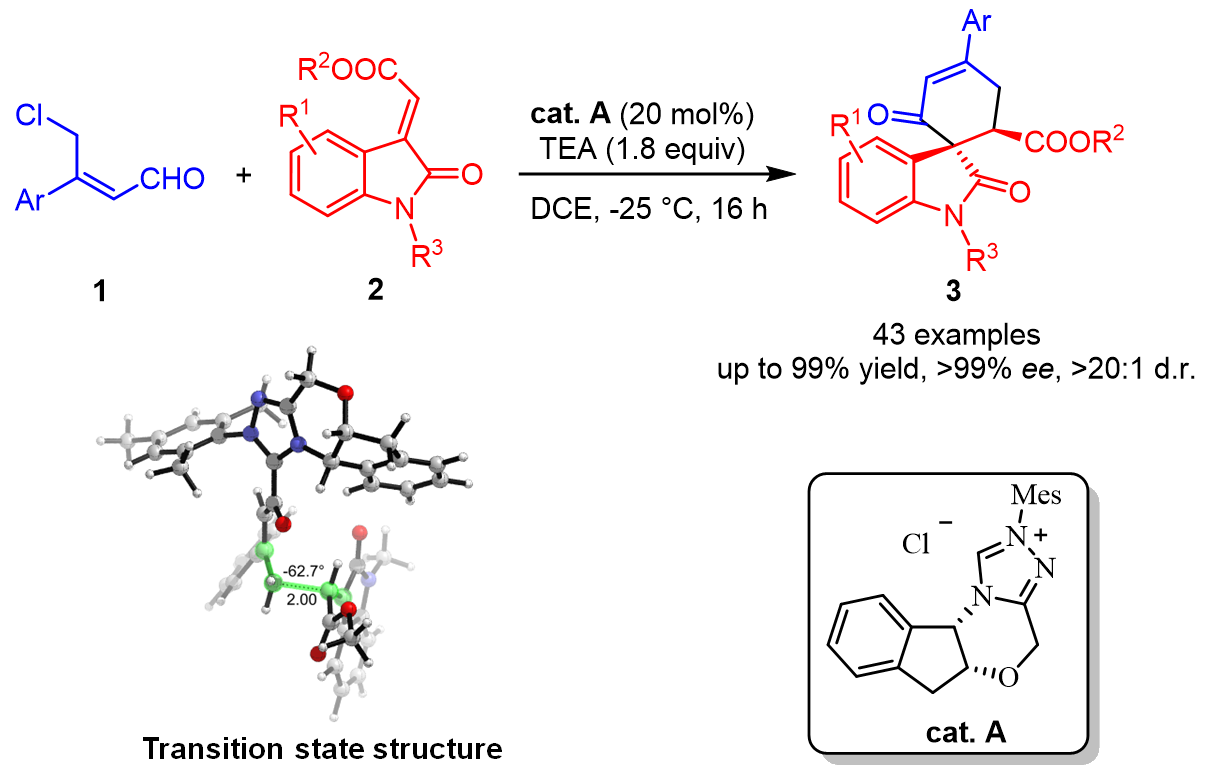 最近,色情聊天-性爱聊天室-黄色聊天软件 杨丽敏副教授课题组基于课题组先前的研究经验(Org. Lett. 2020, 22, 3329;Org. Lett. 2019, 21, 7943;Chem. Commun., 2018, 54, 1567),与东方理工高等研究院的钟国富教授合作报道了一例手性氮杂环卡宾催化合成手性螺[环己-4-烯-1,3’-吲哚]衍生物的新方法。该催化体系以手性1-氨基-2-茚醇衍生的三氮唑类卡宾为催化剂,以易得的γ-氯代烯醛和靛红衍生的烯酮为底物,顺利合成手性螺[环己-4-烯-1,3’-吲哚]衍生物。反应条件温和,并且无需使用金属和添加剂,官能团耐受性好、收率高、对映选择性好。